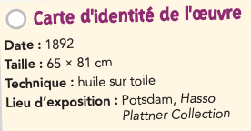 Le ciel et la mer apparaissent dorés. Si tu regardes de près, tu remarqueras que les éléments sont constitués de petites touches colorées, comme de la mosaïque. Ces taches jaunes et orangées pour le ciel et la mer tranchent avec les bateaux, les collines de l’arrière plan et la côte, rendus dans des tons de bleu et de violet. Ils’agit de couleurs complémentaires, qui se mettent en valeur mutuellement. L’ombre du bateau mêlée aux refletssurl’eau rend particulièrement bien compte de la manière dont est constituée l’image. Au premier plan, le débarcadère forme un triangle dans lequel vient se nicher l’ombre des voiles du bateau le plus grand. Ces petits bateaux méditerranéens sont des tartanes qui servaient pour la pêche et le cabotage.